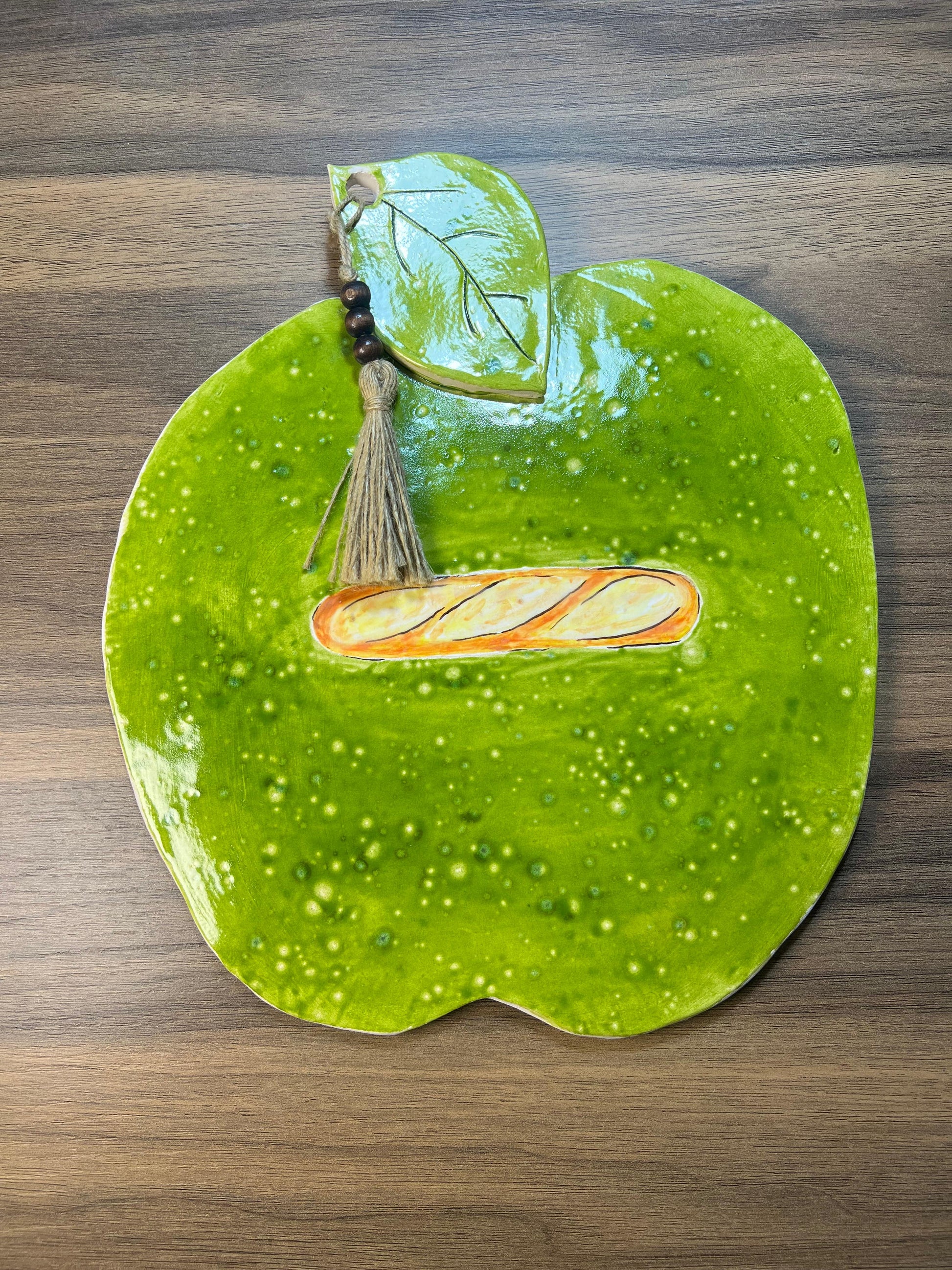 Bu el yapımı seramik sunum tabağı, canlı yeşil yüzeyi ve merkezindeki baguette detayıyla masaya hafif bir oyun duygusu ekler.